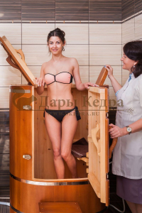 Готовый комплект - это полностью укомплектованный набор с фитобочкой для процедур парения. Овальная модель более просторна и удобна в использовании. Толщина стенок составляет 25 мм. Фитобочка оборудована откидными створками, дверцей и отверстием для головы. Во время парения человек сидит внутри кедровой бочки, а голова находится снаружи. Благодаря этому исключается возможность перегрева. Подлокотники из кедра, встроенные ручки на створках и двери делают эксплуатацию более удобной.